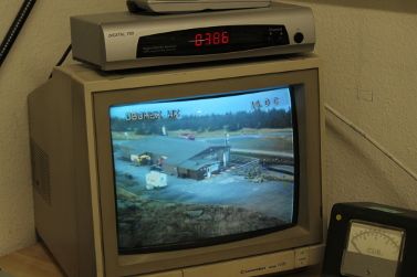 Unsere Station mit einer Kamera und einem Mikrofon sendet ein analoges FM-TV-Signal zum Brockenrelais DB0HEX. Unser Sender ist ein Festfrequenz-Modul mit nachgeschalteter Sendeendstufe auf 2380,500 MHz und einer entsprechenden Antenne.